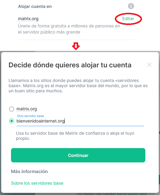 Si no tienes una cuenta puedes crearla en nuestro homeserver abriendo Element (o tu cliente favorito) y apuntándolo a bienvenidoainternet.org como instancia a usar al momento de crear tu cuenta y/o entrar (demostración).